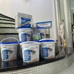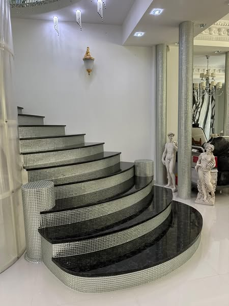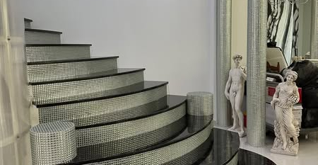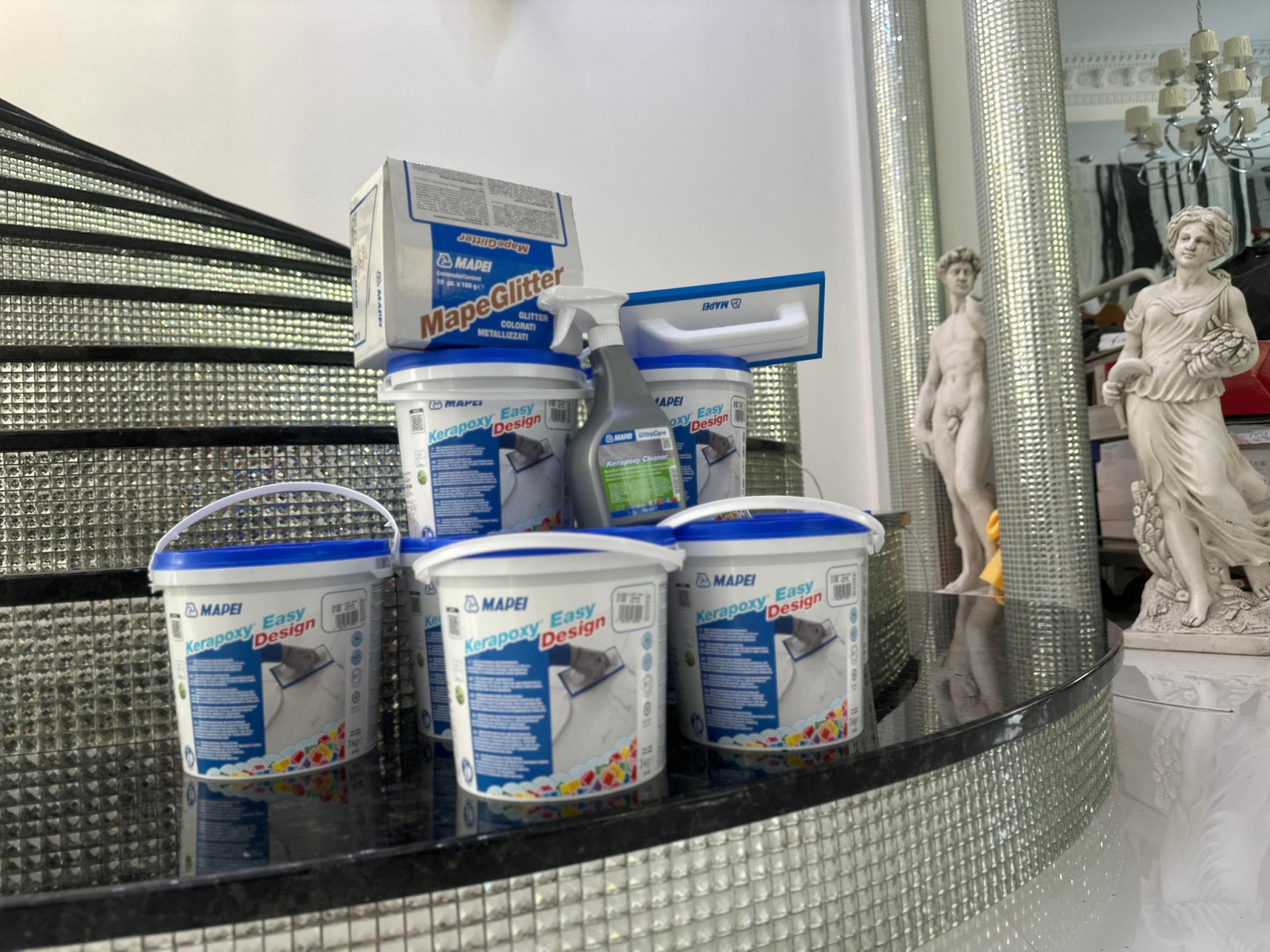 Kāpņu apdare ar stikla mozaīkas flīzēm, kuru šuves aizpildītas ar Kerapoxy Easy Design epoksīda šuvotāju, kam pievienoti MapeGlitter metāliski spīdumi!